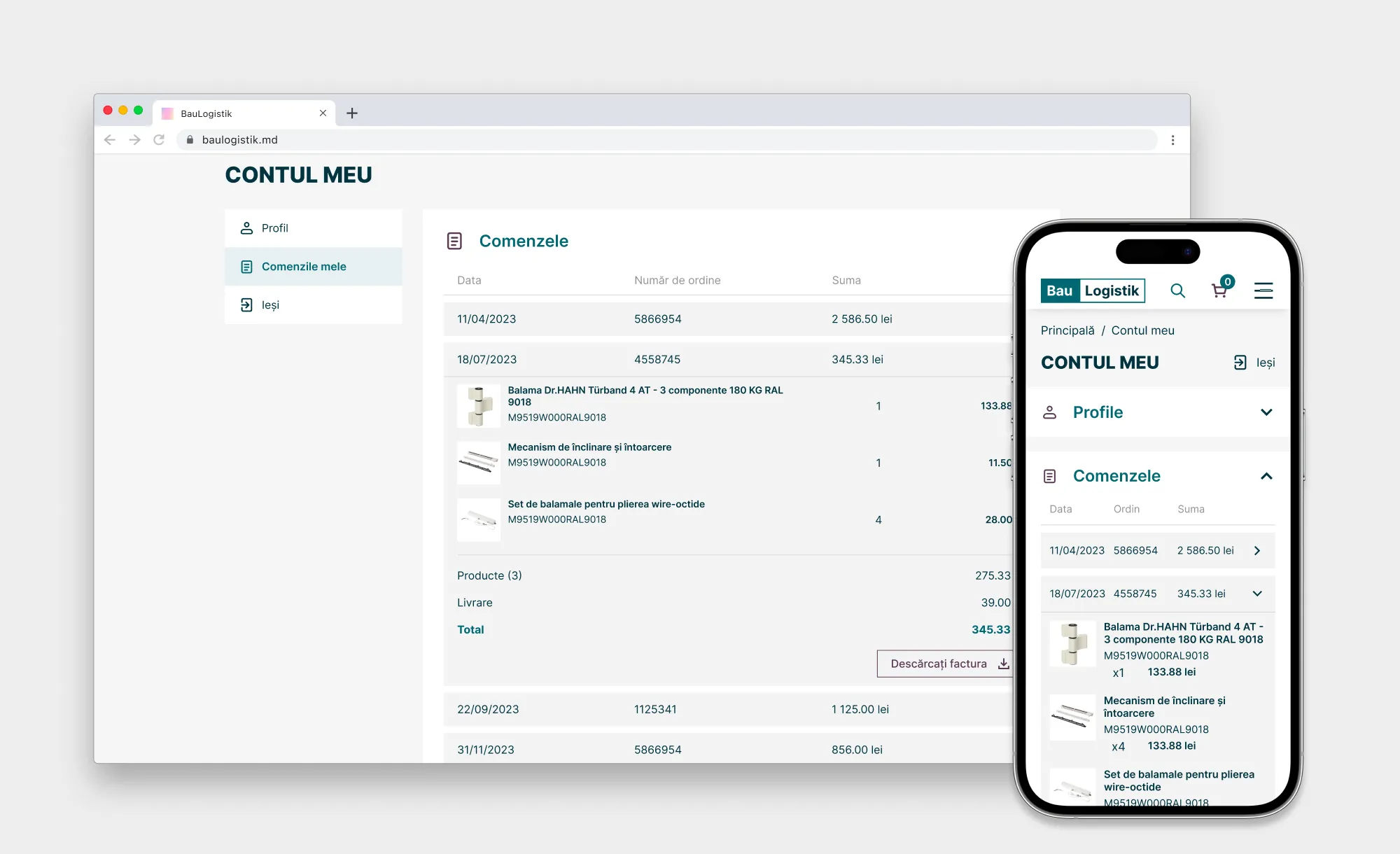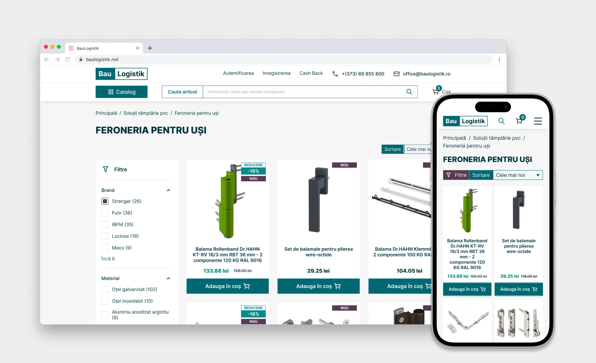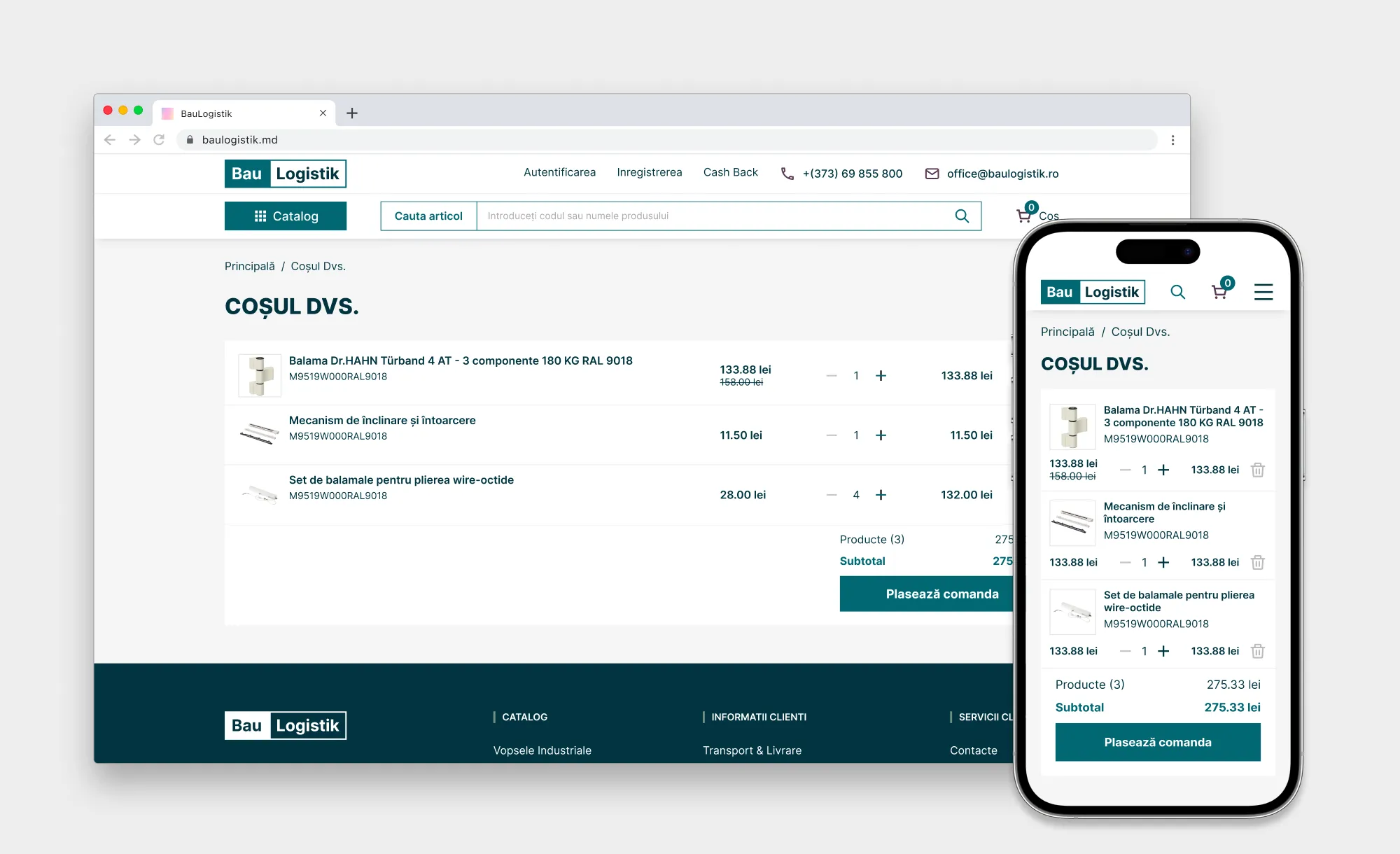 Compania BauLogistik activează pe piețele din Moldova și România, și în procesul de dezvoltare a site-ului, am ținut cont de această specificitate și am creat două versiuni regionale separate, fiecare funcționând în propria monedă.