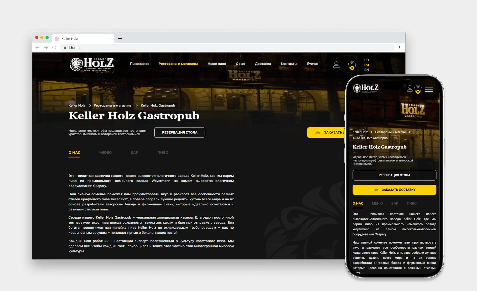 Кроме того, на сайте размещена общая информация о компании, производимом ею пиве, экскурсиях и мероприятиях. Для каждого ресторана создана отдельная лендинг-страница с подробным описанием и возможностью бронирования столов. Такой подход помогает пользователям лучше понять компанию, её концепции и миссию.