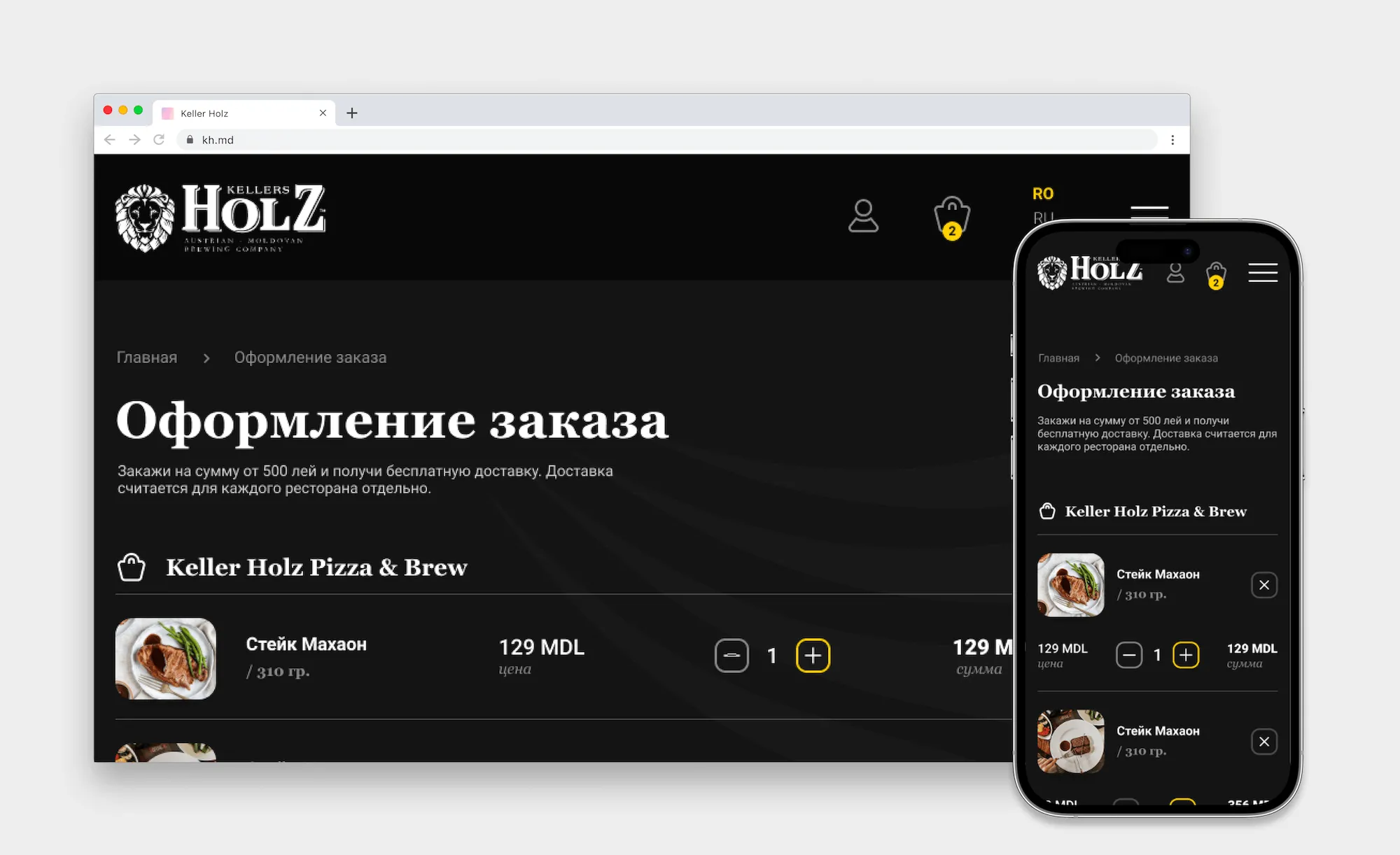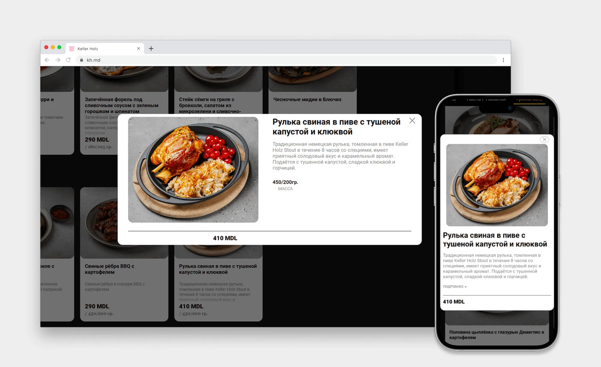 Вся информация о продукции синхронизируется с учётной системой iiko, в которую также автоматически передаются заказы, оформленные на сайте. Основная сложность заключалась в том, что у каждого ресторана - собственная учётная структура, поэтому проект требовал реализации нескольких параллельных интеграций, работающих без конфликтов.
